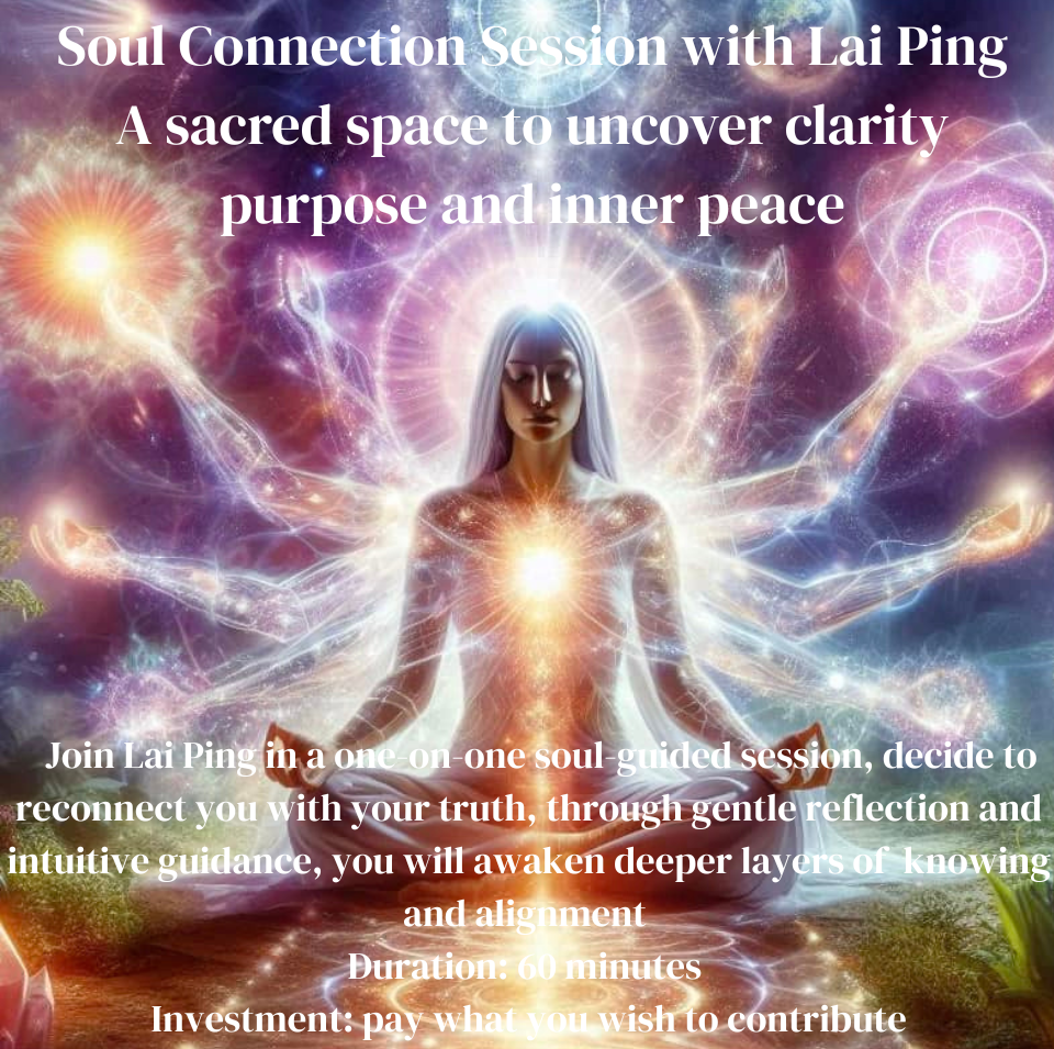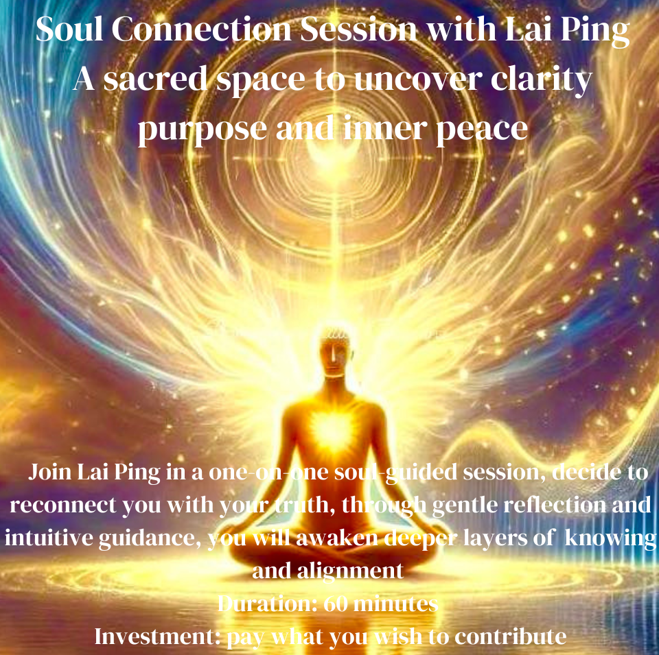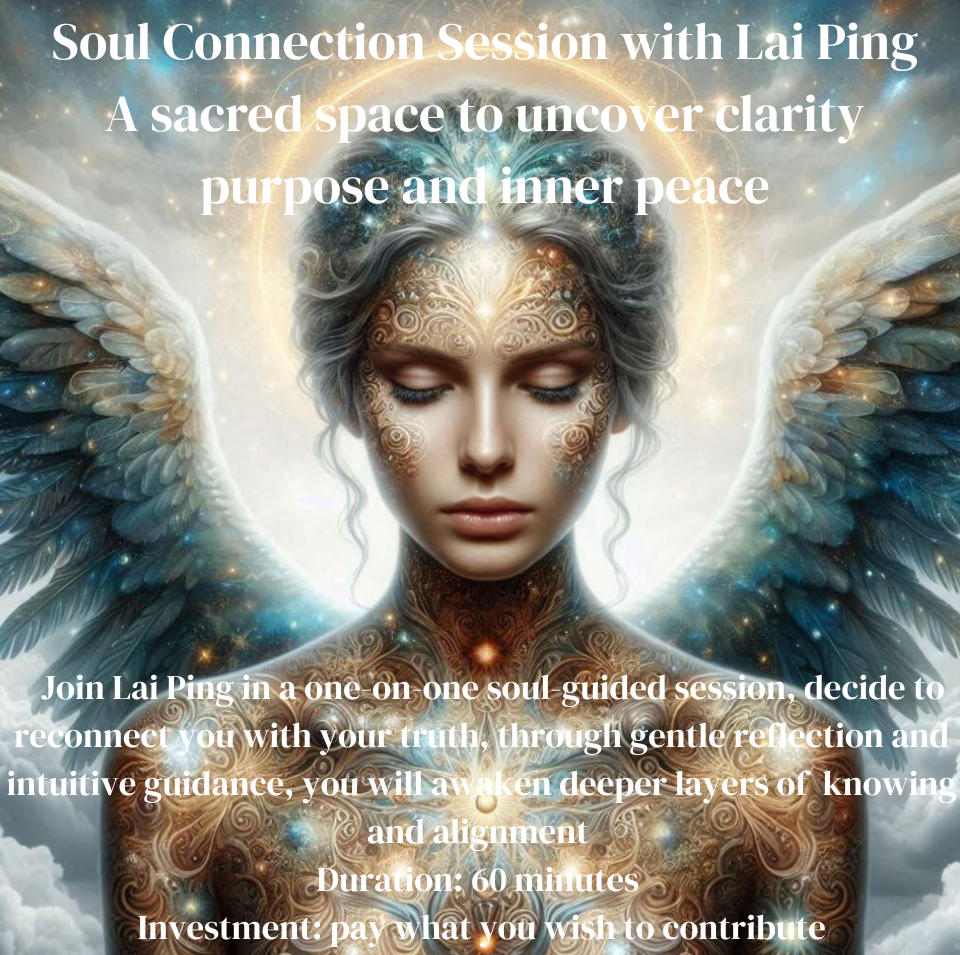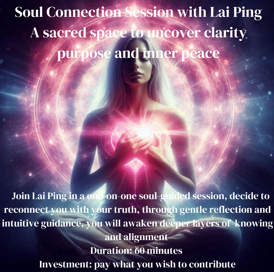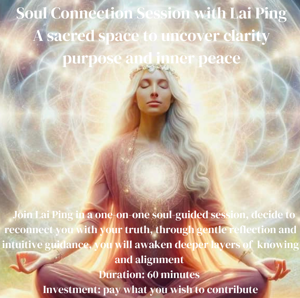 Soul Connection Session with Lai Ping, a sacred space to uncover clarity, objective intention, inner peace, internal joy, self-healing, and self-love.  Join Lai Ping in a one-on-one soul-guided session, dedicated to reconnecting you with your truth, through gentle reflection and intuitive insights, you will awaken deeper layers of knowing and activate your soul’s true purpose.