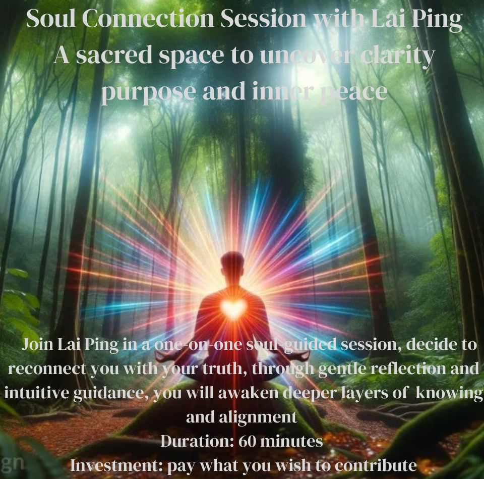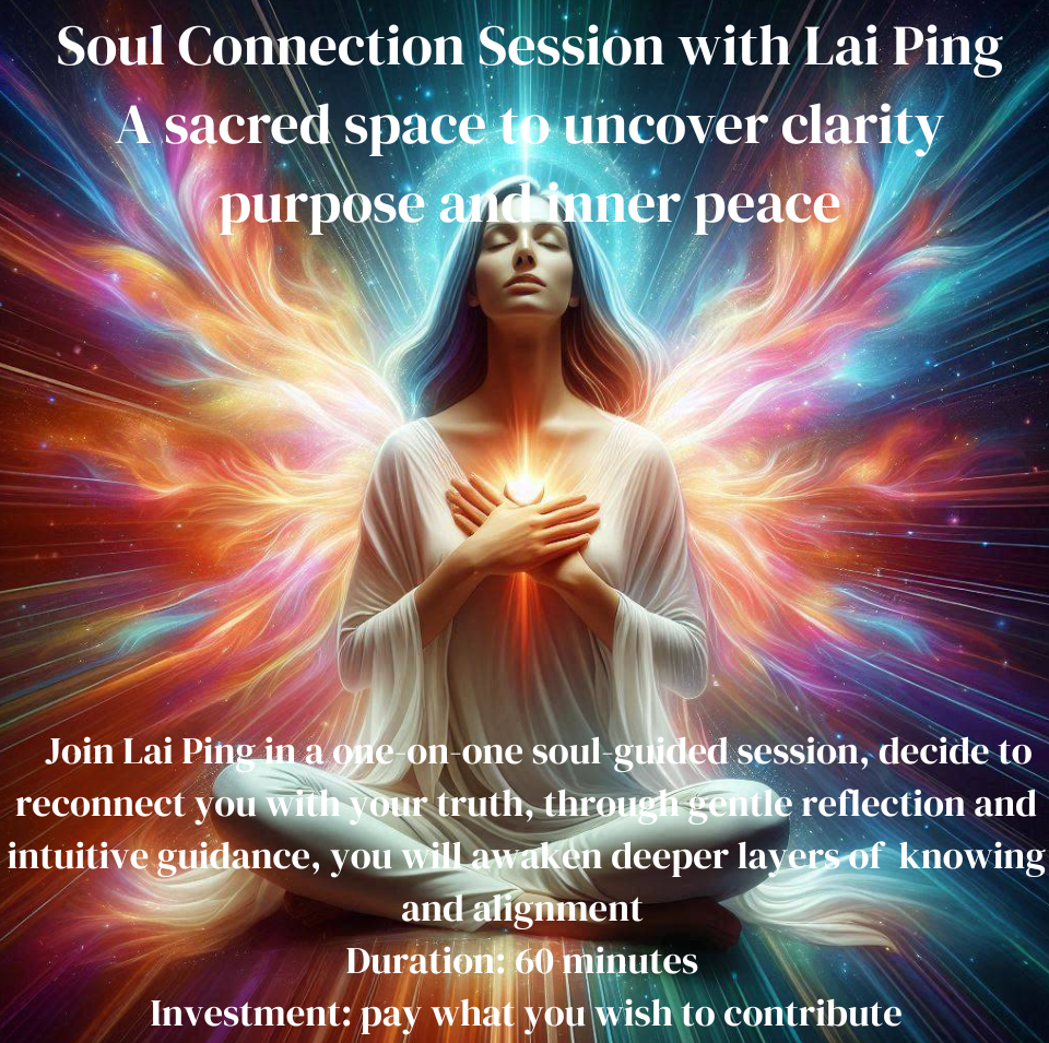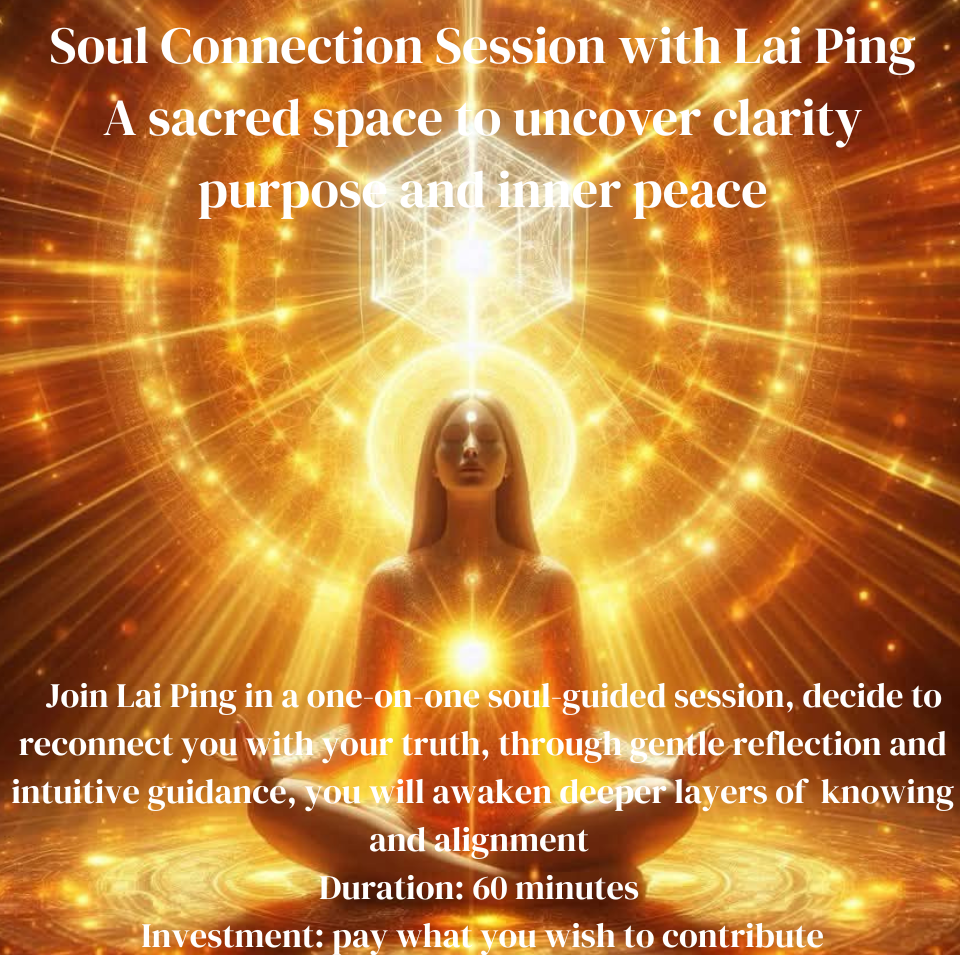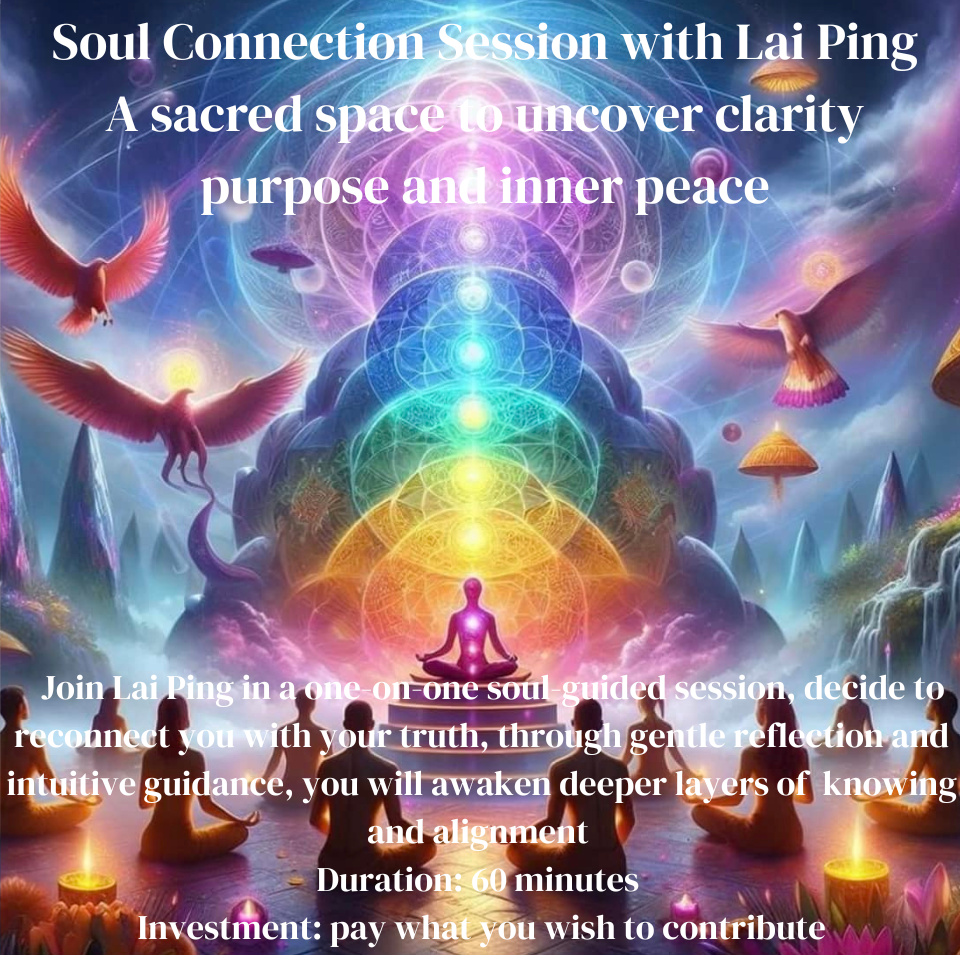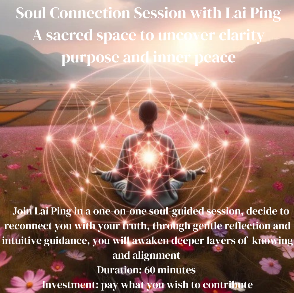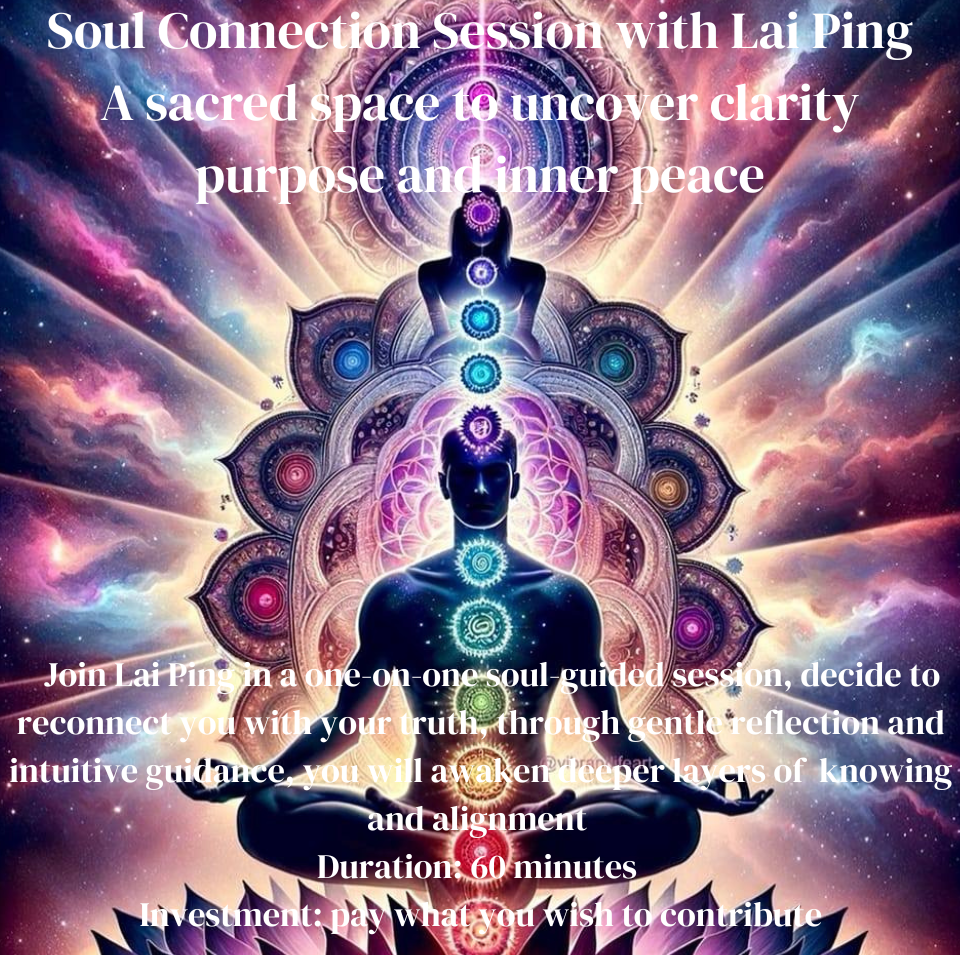 Soul Connection Session with Lai Ping, a sacred space to uncover clarity, objective intention, inner peace, internal joy, self-healing, and self-love.  Join Lai Ping in a one-on-one soul-guided session, dedicated to reconnecting you with your truth, through gentle reflection and intuitive insights, you will awaken deeper layers of knowing and activate your soul’s true purpose.